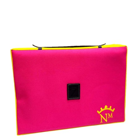 Almohadilla o cojín para ir a los toros, modelo "Capote". La tela es de color fucsia y laterales en color amarillo capote y el revés es en polípiel del mismo color fucsia, tiene el asa de cuero y cremallera. Es lavable en agua fría y te garantizamos la mejor calidad en los materiales. Esta fabricada en España.
