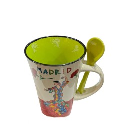 Taza tipo mug con cuchara, modelo Flamenca, con el nombre de Madrid, bonito diseño de bailaora flamenca con sus claveles, recuerdo de España. Diseño tipo trencadís. 300 ml.