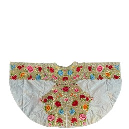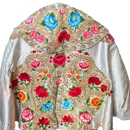 Capote de paseo antiguo, es de segunda mano, sensacional capote de paseo confeccionado por la maestra Nati, es de raso color crema, y bordado en cordón de oro, haciendo flores, claveles y con forro de raso azul de primera calidad, al ser de segunda mano, tiene marcas de uso y de estar guardado, entre los bordados llevan lentejuelas de color oro y azul con mucho brillo.