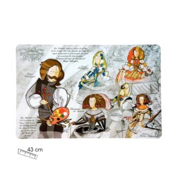 Mantel individual "Las meninas de Velázquez", mantel para la mesa. Con imágenes alegres y modernas de D.Diego de Velázquez y las Meninas de su célebre cuadro. Es de plástico y lavable. Se venden por UNIDAD.