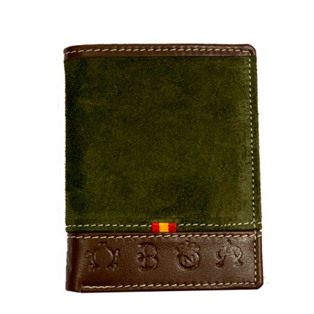 Cartera de ante de hombre con hierros de ganadería y Bandera de España en piel auténtica de Ubrique. De color verde caza y bandera de España y piel marrón. Puede ser en horizontal o vertical y con cierre de botón o sin cierre. Fabricada en España.
