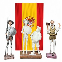 Pareja Don Quijote y Sancho, con escudo y lanza, de color blanco sobre una replica del Libro del celebre Cervantes. Es de Creaciones Nadal, porcelana hecha en España.