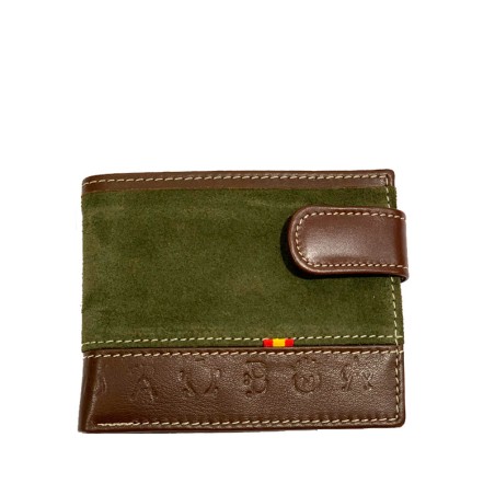Portefeuille pour homme á daim avec fers de bétail et Drapeau Espagne, en cuir véritable Ubrique. En trois couleurs, bleu, brun et beige/bleue. Il peut être horizontalement ou verticalement et avec ou sans fermeture à bouton . Fabriqué en Espagne.