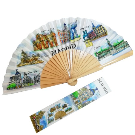 Éventail vintage Monuments de Madrid, orné de diverses illustrations des monuments les plus emblématiques de Madrid. Souvenir de Madrid. Facile à transporter grâce à son crochet pratique, il ne perdra pas sa forme. Livré dans une boîte cadeau en carton.