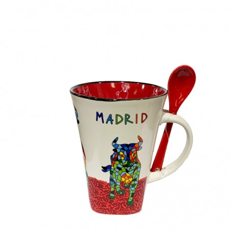 Tasse ou mug de flamenca avec cuillière design trencadís, belles danseuses de flamenco comme décoration avec des oiellets et le nom de Madrid. Fait au ceramique. 300 ml. Mesures: 12 cm de haut x 9 cm de diamètre