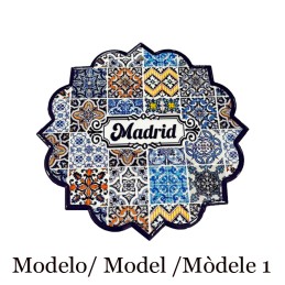 Dessous de plat en forme d'étoile"Souvenirs de Madrid", imitant différents morceaux de carrelage, avec inscription "Madrid", pour dessus de table et pour plats chauds ou il possède également un petit trou dans la partie supérieure pour pouvoir l'accrocher comme décoration. Le dos en liège est présenté dans une boîte en carton pour le protéger.