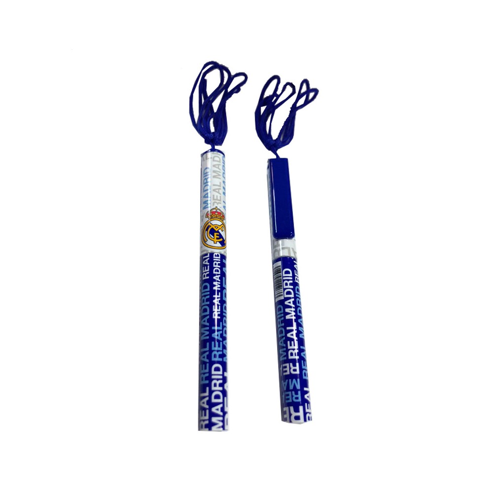 Stylo à bille "Real Madrid" à encre bleue et deux modèles à l'extérieur, bleu ou blanc. Il y a un cordon pour l'accrocher afin de ne pas le perdre.