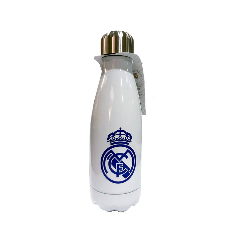 Bouteille isotherme avec l'emblème du club de football "Real Madrid" avec mousqueton à suspendre, en deux couleurs, noir et blanc.