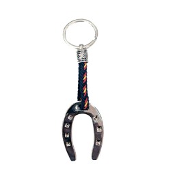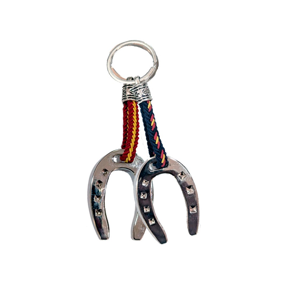 Porte-clés avec des fers à cheval metal, deux modèles: couleur fuchsia (Capote) ou bleu (drapeau Espagne). Fabriqué en Espagne. Mesures: 12 cm de long