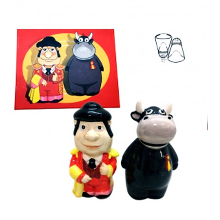 "Bullfighter and bull" Salt and Pepper. what way to present your bullfighting table, for lunch or dinner with friends ans with these two figures of the art of bullfighting. They are ceramic and are presented in a cardboard box that simulates the bullring. Gifts for bullfighting fans.